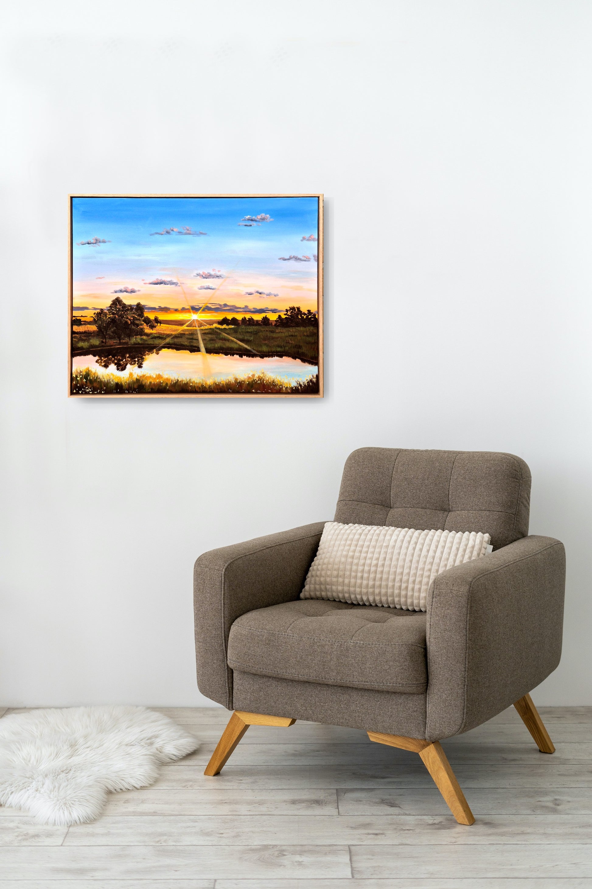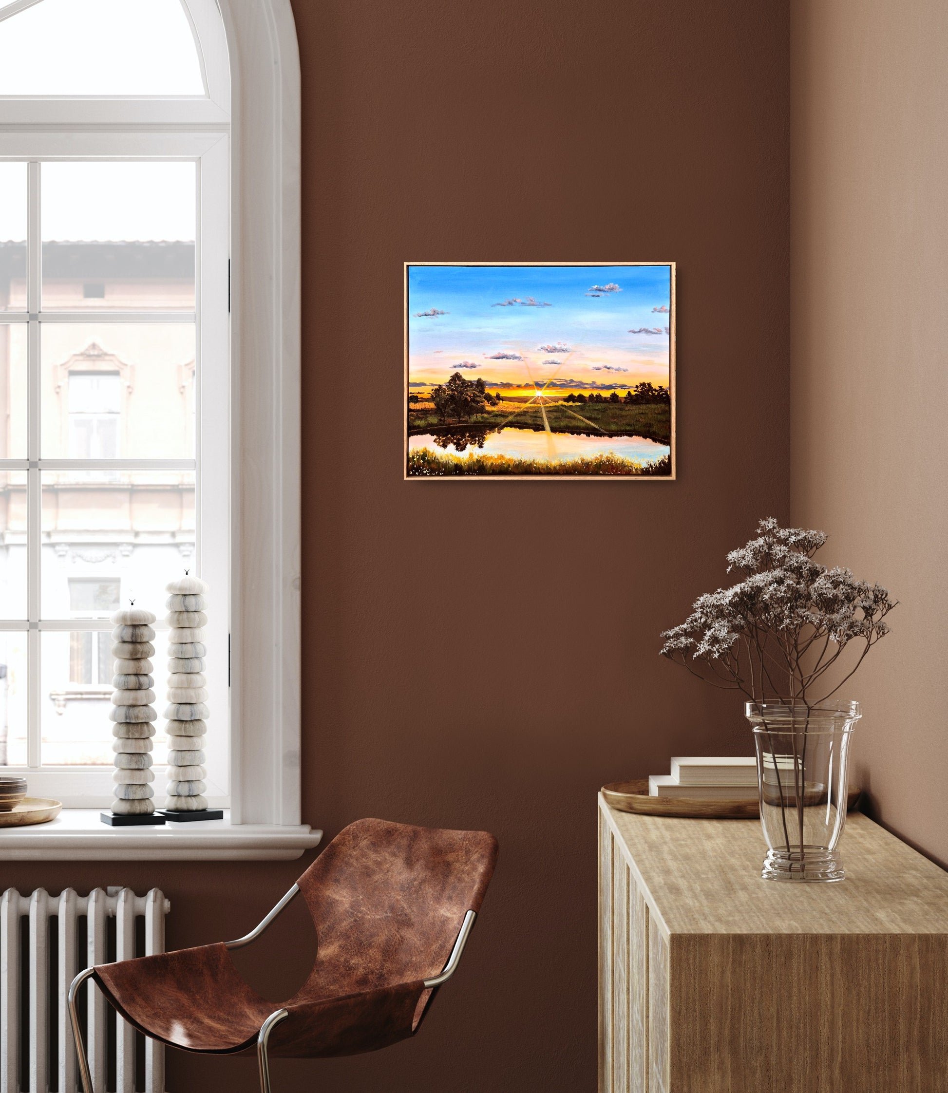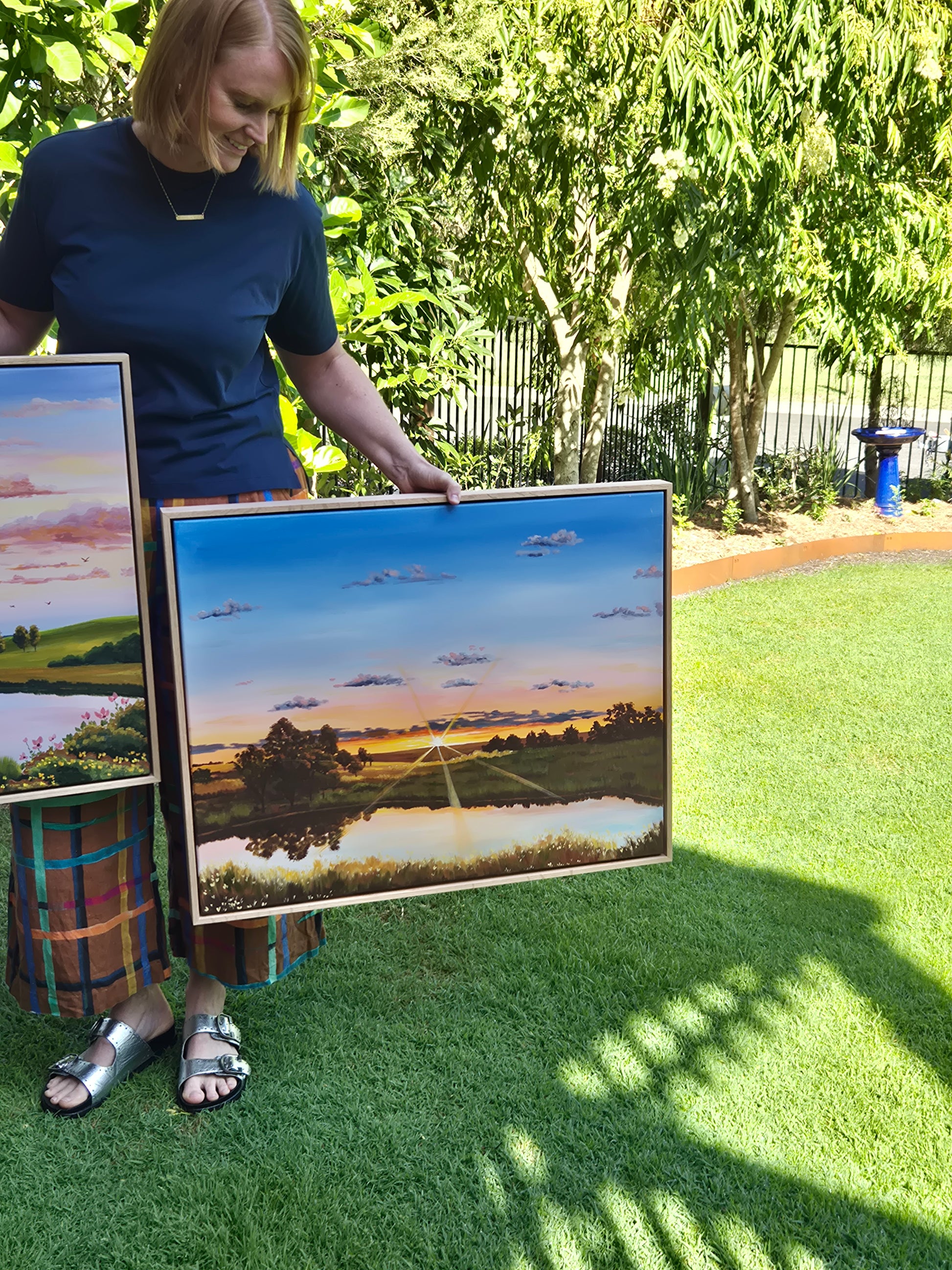Original acrylic on canvas, framed in a beautiful Australian-made oak float frame with D-hooks and wire. Ready to hang.