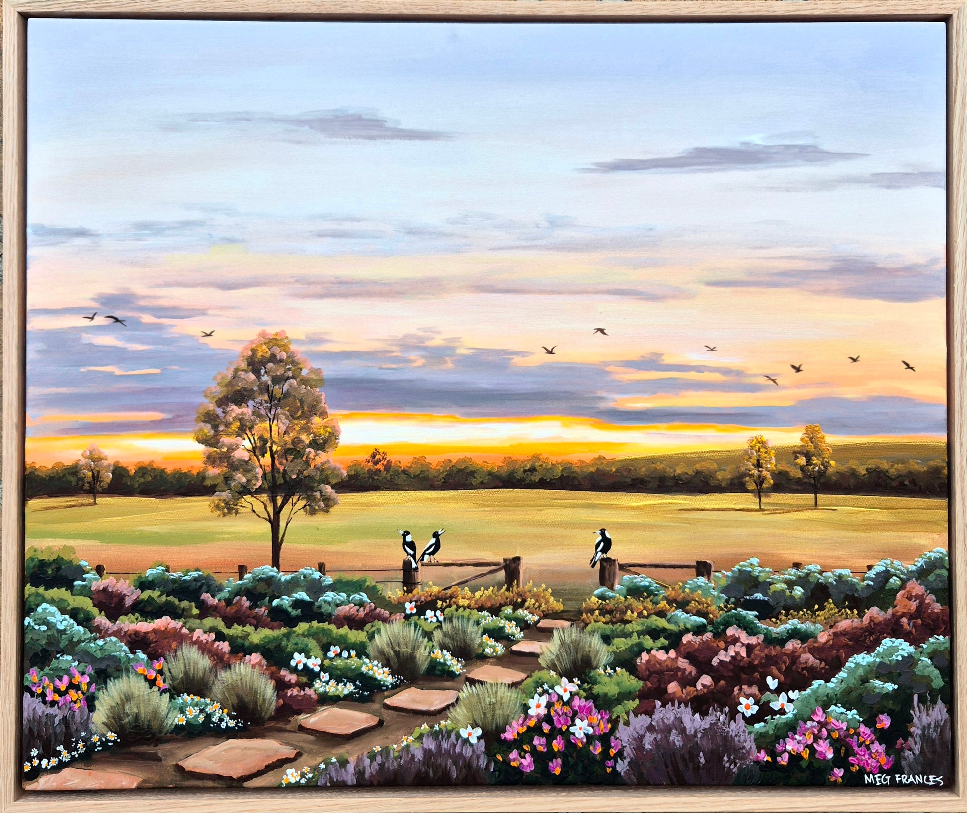 Original acrylic on canvas, framed in a beautiful Australian-made oak float frame with D-hooks and wire. Ready to hang.